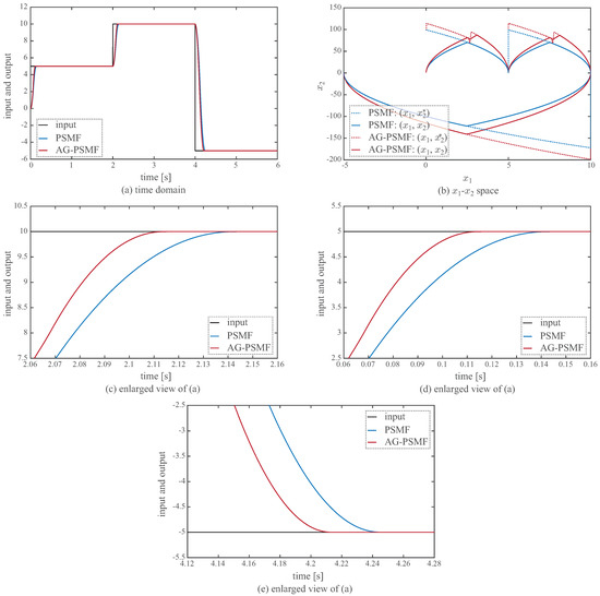 (a–e) Behaviors of AG-PSMF and PSMF for an input with step changes. (AG-PSMF: , , , , ; PSMF: , ; s).