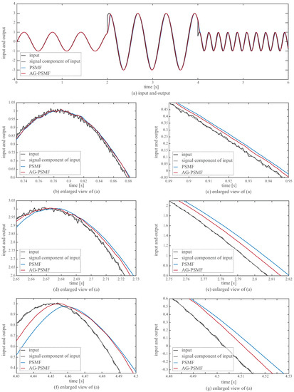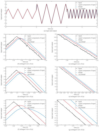 (a–g) Comparison between the outputs of AG-PSMF and PSMF for a triangular input that is corrupted by white Gaussian noise. (AG-PSMF: , , , , ; PSMF: , ; s).