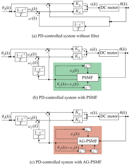 Block diagrams of PD-controlled systems. (a) without filter; (b) with PSMF; and (c) with AG-PSMF.