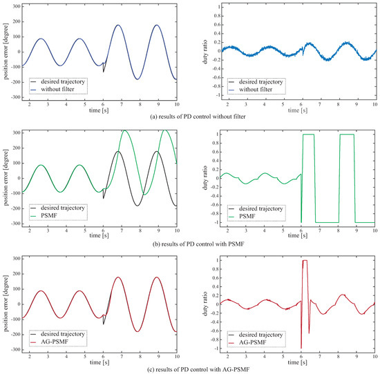 Results of PD control with , and . (a) without filter (b) with PSMF (, ), and (c) with AG-PSMF (, , , , ).