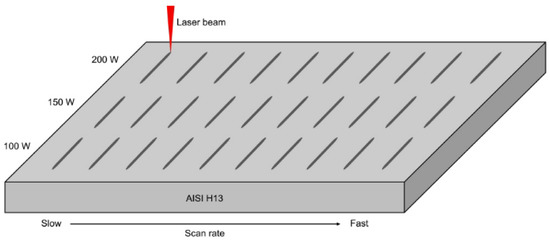 To determine the optimal laser power and scan rate, a single-line formation test was performed, as shown in Figure 1. The Co–Cr alloy powders were homogeneously applied onto the substrate using the powder application system; subsequently, each length (7.0 mm) of powder was selectively irradiated with the laser. The laser powers used were 100, 150, and 200 W, and the scanning rate ranged from 3.66 to 300 mm/s. The energy density was calculated using the following equation [9]: