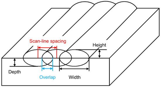 Overlap ratio (%) = (1 − scan-line spacing (μm)/deposited width (μm)) × 100