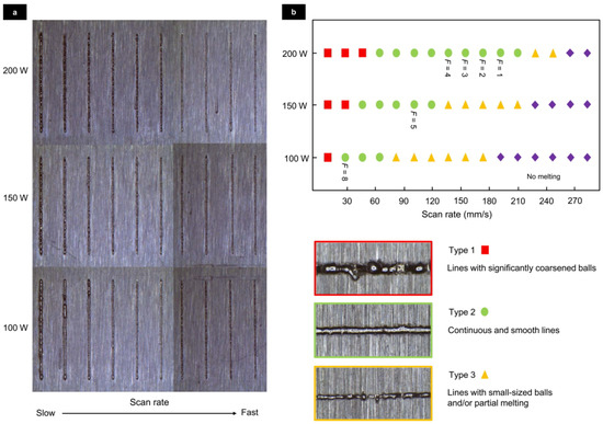 To fabricate defect-free SLM products, it is important to initially optimize the laser power and scan rate [16]. Figure 3 shows the results of the single-line formation test, which was performed to determine the two process parameters. Under all the applied laser powers and scan rates, three different line patterns could be observed, along with no melting [17]. The three different patterns can be described as follows: Single fused lines with significantly coarsened balling (type 1), single fused lines that are smooth and continuous (type 2), and single lines with a small amount of balling and/or discontinuous partial melting (type 3). These three different line patterns can be explained based on the energy density of the laser beam supplied to the metal powders [16].