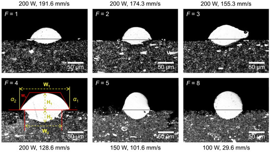 Various bead shapes produced during the single-line formation test under six different conditions (F = 1–5, and 8) (see Figure 3). When the laser power and scan rate were 200 W and 128.6 mm/s, respectively (F = 4, see 2.2 to read the symbols), an optimal bead shape was achieved.