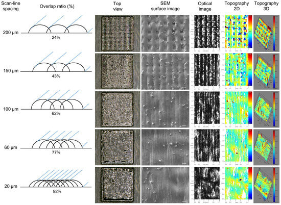 As also shown in Figure 6, the overlap ratio tends to decrease as the scan-line spacing increases (Equation (6)) [22]. Considering the various scan-line spacing values used, the surface shape of the melted powder was classified into three different groups according to the overlap ratio, as follows [12]: (1) a clear mesh-structured surface at small overlap ratios (24% and 43%); (2) a flat and smooth surface by optimal overlapping (62%); and (3) excessive overlapping of the lines of the melted material (77% and 92%) with occurrence of swelling [23]. When the overlap ratios were 24% and 43%, the SEM image showed rough surfaces with many small melt balls [23]. In contrast, when the overlap ratios were excessively high (77% and 92%), swelling, which is the rise of solid material above the plane of powder distribution and melting, was prominent on the SEM surface images [23]. When the overlap ratio was 62%, the SEM image revealed uniform-shaped lines. Although a slight melt ball formation was also detected on the surface, this does not seem to have an obvious detriment to SLM quality [24]. In the present multi-layer formation test, therefore, the most stable deposition was achieved when the scan-line spacing was 100 μm; as a result, the overlap ratio was 62%.