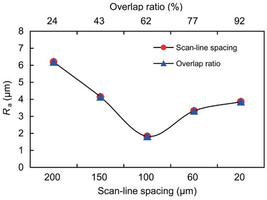 Figure 7 shows the Ra values according to the scan-line spacing values and overlap ratios. When the scan-line spacing was 200 and 150 μm, the surfaces were uneven and had higher Ra values (6.2 and 4.1 μm, respectively); this was probably due to small overlap ratios and the occurrence of the non-connected line formation (Figure 6). When scan-line spacing values of 60 and 20 μm were used, the 3D-printed bodies had rough surfaces (Ra = 3.3 and 3.9 μm, respectively); this was probably due to the excessive melting, swelling, and excessive overlap ratios. The smoothest surface (Ra = 1.8 μm) was obtained when the scan-line spacing was 100 μm (overlap ratio = 62%). These findings suggest that use of the optimal scan-line spacing results in an overlap ratio that is slightly more than 50%, which enhances the surface quality of the 3D-printed Co–Cr alloy products.
