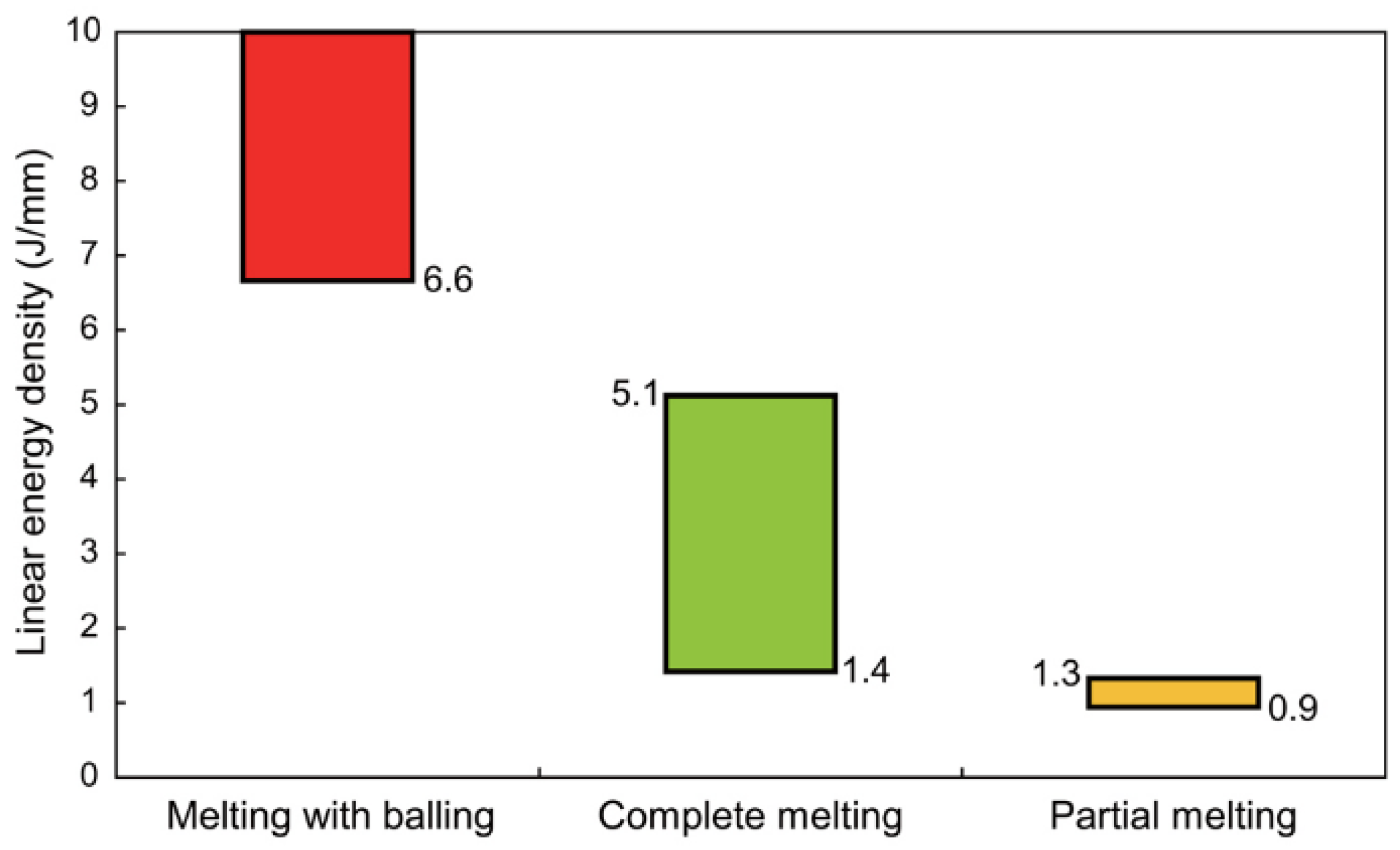 - Ciurana, J.; Hernandez, L.; Delgado, J. Energy density analysis on single tracks formed by selective laser melting with CoCrMo powder material. Int. J. Adv. Manuf. Technol. 2013, 68, 1103–1110. [Google Scholar] [CrossRef]