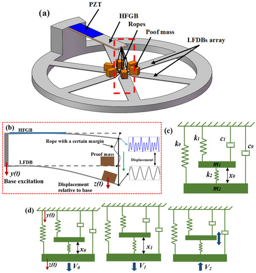 Based on the structure of HFGB driven by multiple LFDBs together, the proposed VEH is based on frequency upconversion and multimodal mechanisms to achieve a superiorly wide bandwidth. Obviously, the novel ropes-driven wideband energy harvester offers two advantages. Firstly, it has the potential to achieve wider or even unlimited bandwidth by adding LFDBs connected with ropes. Secondly, the output power will not be weakened with the increasing number of LFDBs, unlike arrays of beams vibration energy harvester (AB-VEH) for wider bandwidth [19,20,21,22,23], and the reason in shown below.