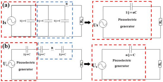 For the traditional AB-VEH, which is composed of multiple beams attached with piezoelectric material as generators, the equivalent circuit model connected in parallel and in series are shown in Figure 2a,b respectively. For convenience of discussion, when ambient vibration frequency is closed to the operation frequency of one generating beam, only this beam works effectively while the others hardly work, which can be regarded as a capacitor with the same value of Cp. Therefore, the equivalent circuit can be simplified to a voltage source , and an equivalent impedance 1/jnωCp in parallel or n/jωCp in series (n = 1, 2, 3, ……), then the maximum output power PLmax delivered to load resistance RL can be determined by