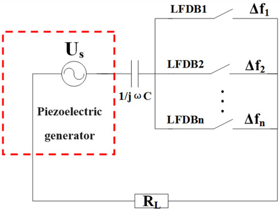 The equivalent circuit model of the proposed ropes-driven wideband VEH is illustrated in Figure 3. Different from AB-VEH, the novel device only has one generating beam. Here, assuming each LFDB works individually for convenience of discussion, when one LFDBi (i = 1, 2, 3, ..., n) drives HFGB to oscillate during its own operation frequency Δfi, the switch corresponding to LFDBi is closed and others are still opened. Thus, if the closed circuit is composed of an equivalent voltage source , impedance 1/jωCp, and load resistance RL, the maximum output power PLmax of RL can be given by
