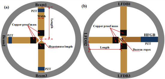 A vertical view of the experimental system is illustrated in Figure 4. As shown in Figure 4a, AB-VEH is composed of a three-beam array with piezoelectric material, PZT (Sinoceramics, Ins., Shanghai, China). The beams array comprises a brass supporting base attached with a PZT (5 mm × 14 mm × 0.15 mm) layer and copper proof mass attached to the top of beams. The resonant frequencies of these three beams are 58.8, 64.4, and 69.8 Hz, respectively, and the detailed geometry is shown in Table 1. In addition, the three piezoelectric beams of the array have the same optimal load resistance of 250 kΩ, and are connected in parallel and series to measure the maximum output power with optimal load resistance. The characteristics of output power are compared with the proposed VEH system to verify the novel system’s superior output performance with the increasing number of beams.