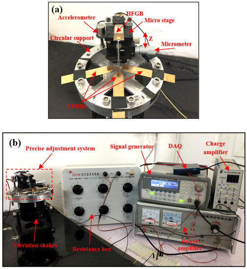 Figure 5 shows the detail experimental setup of the novel PVEH system. To experimentally study the output power, wide bandwidth, and adjustable performance of the novel PVEH system, a precise adjustment system was used to finely adjust the rope margins between the HFGB and LFGB. As shown in Figure 5a, the precise adjustment system comprises a micro-stage, a micrometer, and a circular support. The HFGB is fixed on the micro-stage and then fixed to the circular support, the LFDBs array is fixed on the support directly under the HFGB, such that the relative position of the HFGB and LFDBs can be adjusted accurately by the micrometer with a precision of 0.01 mm in the z-direction. The entire precise adjustment system and the accelerometer are mounted on a vibration shaker as shown in Figure 5b. The vibration frequency and amplitude of the shaker are controlled by a signal generator through a power amplifier. The HFGB is connected with the resistance box, which is as the resistance load, and the voltage of the load is recorded by the DAQ (data acquisition); meanwhile, the acceleration of the system amplified by the charge amplifier is also recorded by DAQ. The AB-VEH system has a similar vibration testing setup which only needs the piezoelectric beams array fixed on the support.