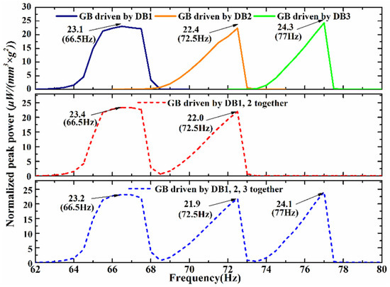 Figure 7 plots the normalized peak power generated by the novel energy harvester with an optimal load resistance of 40 kΩ. Seen from Figure 7, for LFDB1, LFDB2, and LFDB3 driving an HFGB individually, normalized peak output powers of the HFGB are 23.1 μW/(mm3·g2) (66.5 Hz), 22.4 μW/(mm3·g2) (72.5 Hz), and 24.3 μW/(mm3·g2) (77 Hz), respectively; for LFDB1 and LFDB2 driving HFGB together, peak output powers of the HFGB are 23.4 μW/(mm3·g2) (66.5 Hz) and 22.0 μW/(mm3·g2) (72.5 Hz), respectively; for LFDB1, LFDB2, and LFDB3 driving HFGB together, peak output powers of HFGB are 23.2 μW/(mm3·g2) (66.5 Hz), 21.9 μW/(mm3·g2) (72.5 Hz), and 24.1 μW/(mm3·g2) (77 Hz), respectively, which clearly shows that the peak output powers are almost unchanged by the number of LFDB. Hence, it is possible to achieve much wider or even unlimited bandwidth with unchanged output power by adding LFDBs. In addition, the frequency response of individual LFDBs driving the HFGB has the frequency-widened-bandwidth performance. For the same frequency bandwidth environment, the novel VEH needs fewer low-frequency beams than the AB-VEH. Also, it can be seen that the output power of the novel VEH is different than the AB-VEH, which is reduced with increasing the bandwidth. It should be pointed out that the current experimental study is focused on demonstrating wideband characteristic of the proposed VEH, and the design of the novel VEH has been not optimized for practical applications in terms of output power [4] and voltage [33]. In fact, as shown later, the performances are affected by multiple parameters such as beam’s stiffness and rope margin, thus better performances are expected through optimization of parameters.