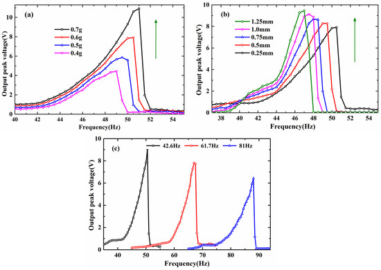 According to the analytical model of the wideband VEH using a stopper, in this model, certain parameters—such as input acceleration, rope margin, and stiffness of driving beam—show strong influences on the frequency response. As shown in Figure 8, based on the structure of individual DB driving the GB, each of these three parameters has been investigated separately by keeping the other two parameters fixed. Figure 8a shows the output peak voltage against excitation frequencies from 40 to 55 Hz with different accelerations for a fixed rope margin (0.25 mm) and stiffness, result in the resonant frequency of 42.6 Hz. In fact, as the base acceleration increases from 0.4 g to 0.6 g, the output voltage and operating bandwidth of the GB increase, since the vibration amplitude of the DB increases. Likewise, for a fixed acceleration of 0.6 g and stiffness of 42.6 Hz, the frequency response with various rope margins is shown in Figure 8b. As can be seen, a lower rope margin results in a wider operating bandwidth at the expense of a reduction in the output voltage. Figure 8c plots the frequency response with different frequency characteristic of the DB at an acceleration of 0.6 g and rope margin of 0.25 mm. It is seen that a lower stiffness of the DB results in a higher output voltage. Further, for a given acceleration, the extractable energy from the beam is inversely proportional to the resonance frequency [4]. Thus, the lower the frequency of the DB is, the higher the output voltage of the GB is. From the above results, it can be seen that the output and wideband behaviors of individual DB driving the HFGB are strengthened by an increase in the input acceleration and a decrease in the stiffness of the DB. There is a tradeoff for the rope margin, since it affects the frequency bandwidth and output behaviors with an opposite trend.
