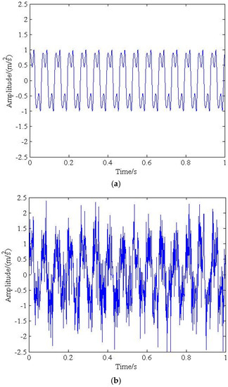 The clean signal and noisy signal with . (a) The time response of the clean signal; (b) The time response of the noisy signal.