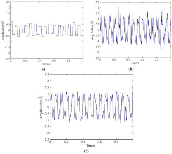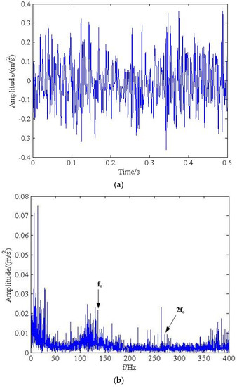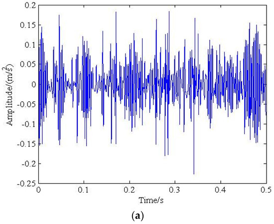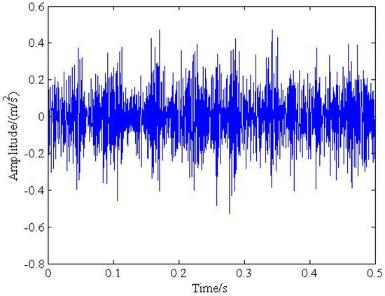 In order to obtain the running state of the fan, the US Emerson CSI2130 vibration acquisition equipment is used to test the vertical position of the bearing in Figure 7. The type of tested roller bearing is SKF22230. Equipment operating parameters, data acquisition parameters and bearing fault frequencies are shown in Table 3. The sampling rate is 2560 Hz, the rotation frequency is Hz and the fault frequency of the outer race is Hz, respectively. The measured vibration signal of an exhaust fan in time-domain is plotted in Figure 8. The time scale is selected from zero to 0.5 s so as to display the the detailed information on the measured signal.
