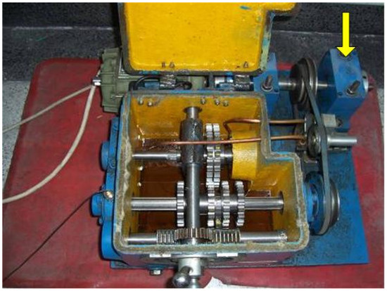 A great impact on production can be caused in actual operation when failure occurs in rolling bearing. The recognition of bearing failure mostly depends on bearing fault characteristic frequency extraction. In order to verify the effectiveness of the proposed method in the experiment, the signal of bearing test rig is employed to perform analysis. The structural of bearing test rig is shown in Figure 3 and the whole experiment device is driven by a 220 V (550 W~50 Hz) AC motor. The position of the yellow arrow in the figure is replaceable bearing. The electrical discharge machining (EDM) method was used to pitting the replaceable bearing outer ring to simulate the bearing outer ring failure. The vertical direction experiment acceleration signals of fault bearing on the right side of test bench were collected by US CSI2130 Data Analyzers. The parameters of the bearing test rig failure frequency are shown in Table 2. It is worthy of mention that the rotation frequency is and fault frequency of the outer race is .