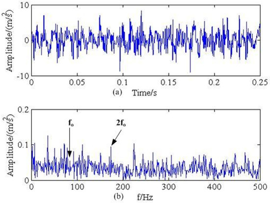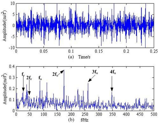 Figure 4 shows the time-domain diagram of the measured vibration signals, which indicates that the outer race fault feature is hardly detected by time-domain characteristic and it is necessary to analyze using the advanced analysis method. Additionally, the noisy component has an impact on the identification of bearing fault characteristic frequency. In order to show the detailed information on the signal with noise, the time scale is selected from zero to 0.25 s.