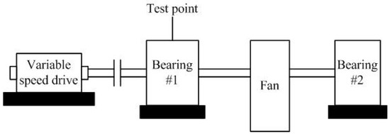 To further verify the proposed improved total variation denoising method in the industrial field equipment fault diagnosis, the bearing signal of an exhaust fan in metallurgical industry was analyzed in this paper. The exhaust fan is mainly used in iron-making processing, which is one of the important pieces of equipment in the plant. The equipment structure diagram and bearing under test position is shown in Figure 7.