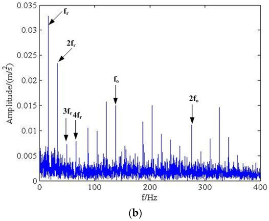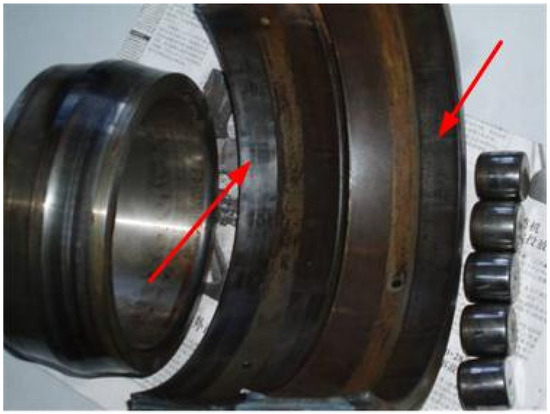 Fan vibration signal is processed by the proposed improved total variation denoising method and typical wavelet denoising method. The results are shown in Figure 9 and Figure 10, respectively. In Figure 9, only the outer race fault frequency and its second harmonic frequency can be detected by the wavelet method, which are not obvious. However, the proposed improved total variation denoising method can find the 16.59 Hz () rotating frequency, second harmonic frequency 33.13 Hz (), third harmonic frequency 49.69 Hz (), the outer ring fault characteristic frequency 138 Hz () and its second harmonic frequency 276 Hz (), shown in Figure 10. Therefore, we can identify the fault of outer race in tested rolling bearing. Then, the first bearing is maintained and disintegrated later. A large area pitting on the outer ring is detected and the side surface of the radial has a serious scratch. The result of the disintegrated bearing is signalled by the red arrow in Figure 11, which is consistent with the results of the vibration testing and signal analysis. Thus, it is illustrated that the proposed approach can be successfully used in industrial bearing fault signal processing.