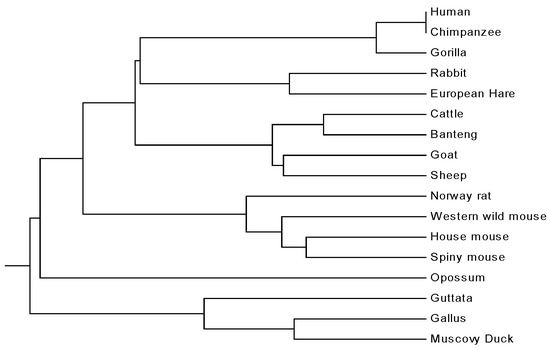 where and are the corresponding vectors for sequences i and j, respectively. Thus, a real symmetric matrix is obtained. On the basis of the achieved distance matrix , a phylogenetic tree can be constructed using a UPGMA (Unweighted Pair Group Method with Arithmetic Mean) program included in the MEGA4 package. It is found that, when and , the non-mammals, including Guttata, Gallus and Muscovy duck, appear to cluster together and stay outside of the mammals, while Opossum is distinguished from the remaining mammals. In addition, Primate group {Human, Chimpanzee, Gorilla}, Cetartiodactyla group {Cattle, Banteng, Sheep, Goat}, Lagomorpha group {Rabbit, European hare}, and Rodentia group {House mouse, Western wild mouse, Spiny mouse, Norway rat} form separate branches, respectively (cf. Figure 2). This result is in accordance with the accepted taxonomy and the literature [1,12,30].