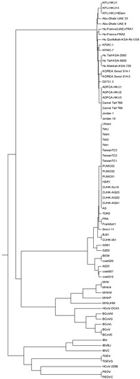 As we see from Equations (8) and (9), the 28-D feature vector consists of three parts: 20 amino acid compositions; 7 correlation factors; and 1 ALE-index. One may be interested in knowing whether or not the last two parts are significant. First and foremost, let us see what would happen if only the first part was used? Without loss of generality, suppose S is a protein sequence and the counts of 20 native amino acids are , respectively. Then we have a multi-set . Based on the knowledge of combinatorics, it is not difficult to see that there are a total of different sequence/strings possessing the same amino acid compostion. This suggests that the amino acid composition alone is not sufficient to represent and compare protein sequences. What would happen if only the first two parts were used (i.e., without using the ALE-index)? By using the vector with the first 27 components, experiments I and II are performed. For the first dataset, there is no significant difference between the tree constructed with the 27-D vector and that with the 28-D vector. For the second dataset, the corresponding relationship tree of coronavirus spike proteins is shown in Figure 4. From Figure 4, it is easy to see that MERS-CoVs belonging to Betacoronavirus appear to cluster together with the three Gammacoronaviruses, instead of the other Betacoronaviruses. This phenomenon is disappointing. For the third dataset, we repeat the three cross-validation tests with the 27-D vector and list the corresponding results in Table 7. By comparing Table 7 with Table 6, we can find that the prediction quality diminished slightly. These results indicate that the ALE-index can make a very positive contribution to the performance of experiments.