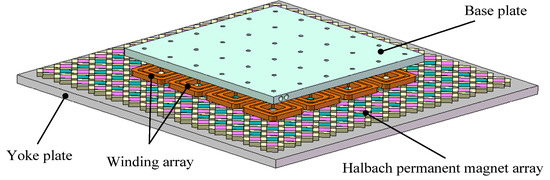 Figure 1 shows the core-less moving-coil maglev permanent magnet planar motor which has the concentric winding structure. It consists of a mover, a stator, and the gap between them. The mover consists of the base plate and the winding array, and the stator consists of the yoke plate and the permanent magnet array. The winding array on the mover is made of 16 concentric windings, which are arranged as a 4 × 4 matrix. The distance between the adjacent winding centers is 6.5 times the pole pitch, which is the pole pitch of the permanent magnet array. An independent drive unit is applied to each set of the windings and power is supplied by cables. The stator permanent magnet is arranged in a Halbach structure, which can increase the flux density near the coils.