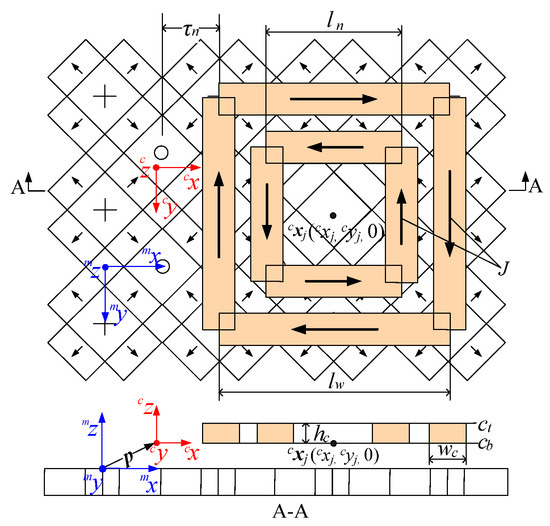Figure 2 shows the model of the concentric winding in the Halbach magnetic field. This can be seen from Figure 2 that one set of concentric windings consists of the outer and inner coils. They are connected in series, but the currents circulating in them are in opposite directions. To simplify the calculation, each of them is simplified into four different cuboids. τn is the pole pitch; lw is the equivalent linear length of the outer coil; ln is the equivalent linear length of the inner coil; wc is the coil width; hc is the coil height; and ct and cb are the height coordinate positions of the coil.