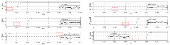The position step signal is given as the reference signal into the six inputs of the control system, respectively. The decoupling can be validated by observing the influence of one input reference signal on the other five degrees of freedom. The simulation time is set to be 0.07 s. One millimeter or 1 mrad is given as the reference signal and they are provided at 0 s, 0.01 s, 0.02 s, 0.03 s, 0.04 s, and 0.05 s, respectively. The simulation result is shown in Figure 6.