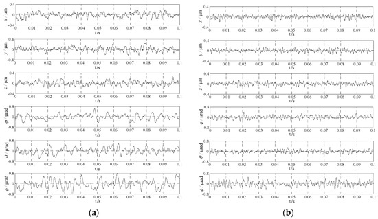 It can be seen from Figure 7 that under the random external disturbance, the position fluctuation for the developed ADRC is much smaller than that of the traditional ADRC. The root mean square deviation method is applied to make the quantitative analysis for the data in Figure 7a. The value of the x-axis is 0.0386 μm, y-axis is 0.0351 μm, z-axis is 0.0336 μm, φ-axis is 0.0588 μrad, θ-axis is 0.0612 μrad, and the -axis is 0.0768 μrad. The same method is applied for the data in Figure 7b, the value of the x-axis is 0.0149 μm, y-axis is 0.0132 μm, z-axis is 0.0121 μm, φ-axis is 0.0382 μrad, θ-axis is 0.0335 μrad, and the -axis is 0.0481 μrad. It can be seen that, through the deviation analysis, the influence on the planar motor position from force and torque disturbances is weakened by applying the improved ADRC. Thus, it can be concluded that the proposed developed ADRC has better anti-disturbance performance compared with the traditional ADRC.