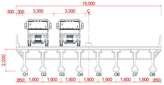 To determine the appropriate cross section of the PSC-I girder, the standard cross-section of a 30-m-long PSC-I girder provided by the Korea Express Corporation (Seoul, Korea) was utilized. Table 1 and Figure 1 present the data specifications and cross-sectional profiles of the sample bridge at the mid-span.