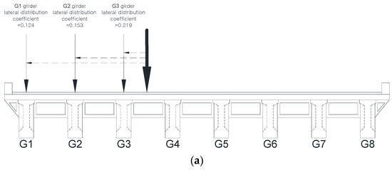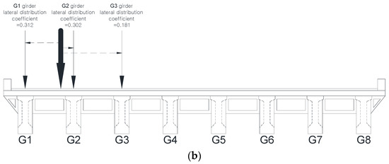In current bridge designs, the DB-24 load and DL-24 loads are applied [6]. These do not reflect the actual traffic characteristics of the bridge once it is in service. In this study, in order to determine the required performance, an annual extreme load that reflects the actual traffic characteristics was referenced, as listed in [12,13]. In these studies, the effect of the annual extreme load on bridges was calculated by considering various traffic characteristics, including the AADT, heavy vehicle proportion, vehicle running pattern, bridge, and lateral load distribution of the bridge. Table 6 presents the probabilistic distributions of passing vehicles: mobile cars (P), buses (B), mid-size trucks (T), heavy trucks (TT), and semi-trailers (ST). The first mode indicates the empty or lightly loaded condition, and the second mode represents the heavily loaded condition. In order to reflect the running patterns of vehicles passing the bridge, the running speed ratio of vehicle per AADT, the inter-vehicle distance models, and the vehicle consecutive models were measured (Table 7). Table 8 and Figure 2 present the calculated lateral load distribution coefficients of the sample bridge via finite element analysis and the results with them. The heavy vehicle distribution proportion per lane was set to 15:85 as recommended by the Korea Highway Bridge Specifications [6]. Based on the traffic characteristics suggested above, the annual extreme load applied to the sample bridge was analyzed (Table 9).