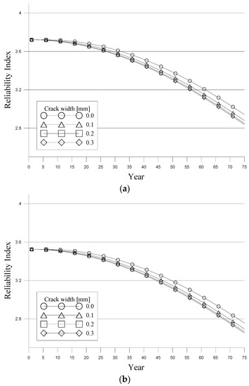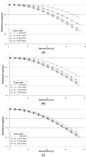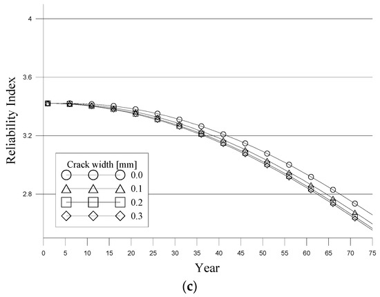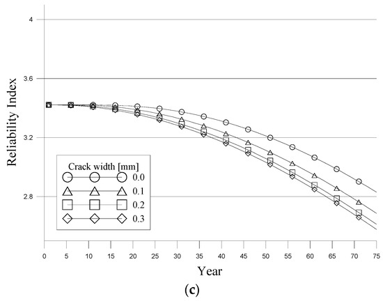 Reliability degradation considering the crack width in a normal environment: (a) light traffic (AADT: 10,000, heavy vehicle proportion: 15%); (b) normal traffic (AADT: 20,000, heavy vehicle proportion: 25%); and (c) heavy traffic (AADT: 40,000, heavy vehicle proportion: 35%).