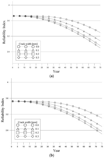 To consider the effect of cracks on the resistance capacity, the existence and size of cracks in the girder were classified in the analysis. Based on the concrete component condition assessment criteria specified by the Korea Infrastructure Safety and Technology Corporation (Seoul, Korea) [18], the time until the concrete experiences performance degradation was analyzed under normal conditions (without cracks) and when cracks formed with widths ranging from 0.1 to 0.3 mm. Table 12 lists the conditions for resistance capacity degradation caused by chloride attack and carbonation.