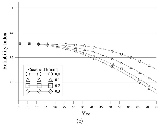 Reliability degradation considering the crack width in a severe environment: (a) light traffic (AADT: 10,000, heavy vehicle proportion: 15%); (b) normal traffic (AADT: 20,000, heavy vehicle proportion: 25%); and (c) heavy traffic (AADT: 40,000, heavy vehicle proportion: 35%).