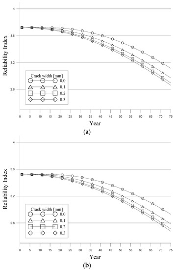 Figure 4, Figure 5 and Figure 6 present the changes in the annual reliability index depending on the service life, site environment of the sample bridge, and cracks. The reliability index varied in the range of 3.29 to 2.61 depending on the formation of cracks and traffic conditions (light, normal, heavy) in a mild corrosive environment. The reliability index varied in the range of 3.11 to 2.58 depending on the formation of cracks and traffic conditions (light, normal, heavy) in a normal corrosive environment. The reliability index varied in the range of 2.94 to 2.55 depending on the formation of cracks and traffic conditions (light, normal, heavy) in a severe corrosive environment. These results indicate that the annual reliability indices for PSC-I girder bridges with 75 years of service vary significantly depending on differences in the corrosive environment, traffic conditions, and crack formation.