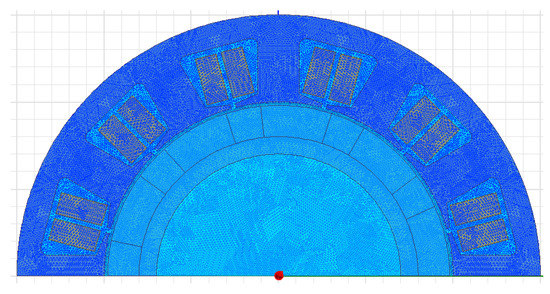 Equation (13) shows that the fundamental loss of the PMSM is only a function of the rotational speed ωr, the d-axis current id and the q-axis current iq. This proposed fundamental loss calculation method is verified by finite element analysis (FEA) based on a 5 kW PMSM. The FEA model is shown in Figure 3.