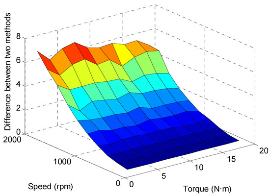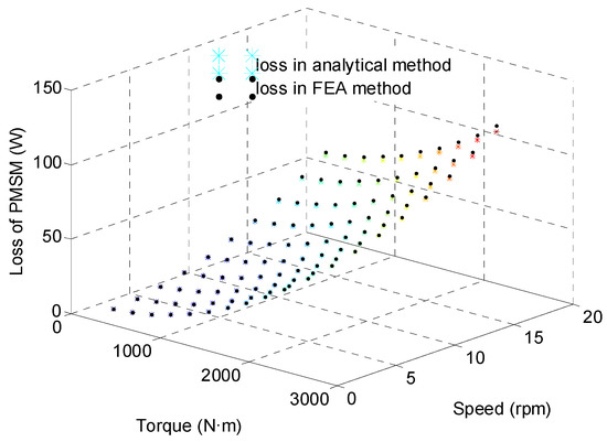 Based on the FEA, the analytical results of the motor fundamental loss compared with the simulation results of the FEA at different speeds and torques are illustrated in Figure 4. Additionally, the difference of the motor loss calculated by the FEA method and the proposed analytical method is shown in Figure 5.