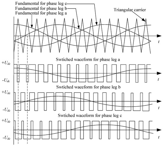 The typical working principle of SPWM is shown in Figure 7. The three-phase sinusoidal references displaced in time by 120°, viz: