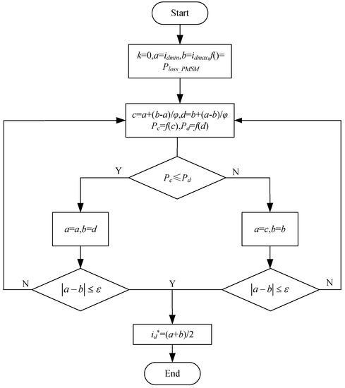 The MEPT control can make the d-axis flux-weakening current remain the optimal value id* and achieve the maximum efficiency of the PMSM in the whole operation range. As Equation (36) makes it too difficult to acquire the analytical solution of the optimal current, this paper applied the golden section method to obtain the numerical solution of the optimal current. The golden section is a technique for finding the minimum value of a unimodal function by successively narrowing the range of values inside which the minimum is known to exist. The flowchart of the golden section procedure is shown in Figure 9, where is the golden ratio: .