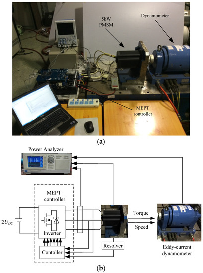 Figure 11a,b show the efficiency of the PMSM using the traditional id = 0 control and proposed MEPT control, respectively, where the maximum efficiency of the PMSM using id = 0 control is 94%. It can be seen that the MEPT control can broaden the high-efficiency field of the PMSM and obtain a higher efficiency in each operation condition of the PMSM. It is shown in Figure 11c that the efficiency can be increased in the whole operation range of the PMSM and the maximum efficiency enhancement is 0.36%.