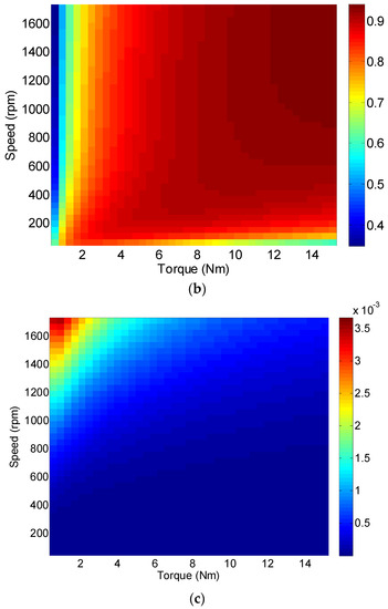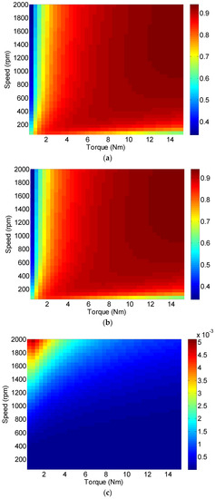 Results of the PMSM in SVPWM: (a) Efficiency of PMSM in traditional id = 0 control; (b) Efficiency of PMSM in proposed MEPT control; (c) Difference of efficiency between id = 0 control and MEPT control.