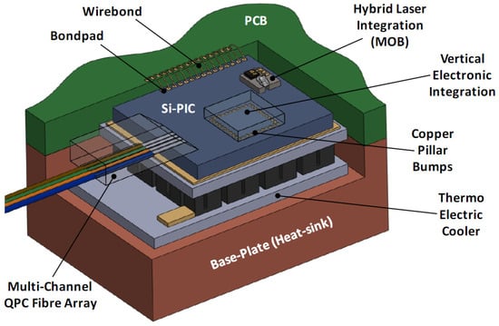 Schematic of a Si-PIC (photonic integrated circuit) packaged with a multi-channel quasi-planar coupled (QPC) fiber-array, a hybrid-integrated laser source based on a micro-optic bench (MOB), a vertically integrated electronic integrated circuit (EIC), and a thermo-electric cooler. Electrical connections between the PIC and PCB (printed circuit board) are made by wire-bonds, while the connections between the PIC and EIC are made using copper pillar bumps (CPBs).