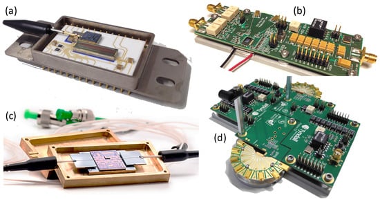 Examples of packaged photonic modules; (a) Single-channel PIC with side-by-side electronic integration; (b) Optical Network Unit (ONU) of the FP7-FABULOUS project; (c) Single-channel in/out photonic module with vertically integrated electronic chip; (d) 8-Channel Transceiver for the FP7-PLAT4M project.