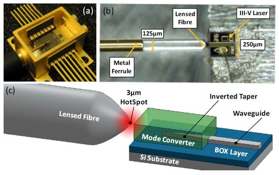 Fiber-to-PIC edge-coupling; (a) Kovar ‘butterfly’ package for edge-coupling. Kovar has the same thermal expansion coefficient as glass, so the Fiber-to-PIC alignment can be maintained, when the ambient temperature changes; (b) Microscope image of an edge-coupling to a III-V laser-chip using a lensed fiber. The fiber is mounted into a metal ferule, so it can be laser-welded to the kovar butterfly package; (c) Schematic of edge-coupling to a Si-PIC using a lensed-fiber and spot-size converter (SSC), or mode-converter (MC), to help bridge the gap between the mode-size in the fiber and on-PIC waveguide.