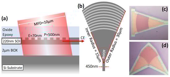 - Taillaert, D.; Van Laere, F.; Ayre, M.; Bogaerts, W.; Van Thourhout, D.; Bienstman, P.; Baets, R. Grating couplers for coupling between optical fibers and nanophotonic wave-guides. Jpn. J. Appl. Phys. 2006, 45, 6071–6077. [Google Scholar] [CrossRef]