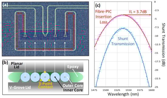 Optical shunt to support the active-alignment of a multi-channel fiber-array to a Si-PIC; (a) Microscope image of an optical-shunt and three intermediate couplers—2 × 1D grating-couplers, and 1 × 2D grating-coupler); (b) Schematic of a multi-channel fiber-array showing how three-point contact allows for precise alignment of the fibers in the v-grooves; (c) The transmission spectrum of the optical-shunt, showing the bandwidth of the grating-couplers. As the shunt is symmetric and has negligible waveguide-losses, the insertion-loss (IL) in units of dB is simply half of the optical-shunt transmission in units of dB.