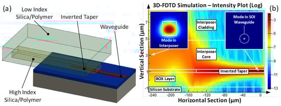 Evanescent coupling from an optical-chip to a Si-PIC; (a) Schematic of the evanescent coupling scheme, showing the inverted-taper on the Si-PIC and the wave-guiding region of the optical-chip (high-index polymer core surrounded by a low-index polymer cladding); (b) Mode propagation and 3D-FDTD (finite difference time domain) simulations illustrate the transfer of light between the optical-chip and Si-PIC.