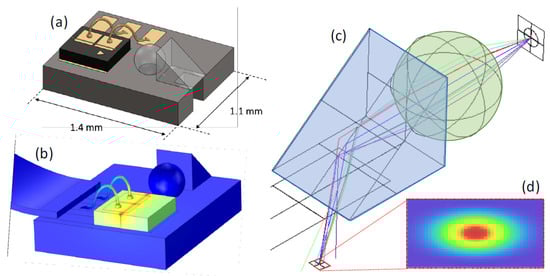 Tyndall micro-optical bench (MOB); (a) Schematic of the MOB showing the laser-chip, ball lens, and micro-prism; (b) COMSOL-software thermal model of the MOB showing the elevated temperature of the laser-chip during CW operation; (c,d) Zemax ray-tracing applied to the MOB shows how emission from the laser-chip is re-imaged onto the grating-coupler on the surface of the PIC. Unlike a fiber-mode, the re-imaged spot is elliptical, just like the mode form the laser-chip.