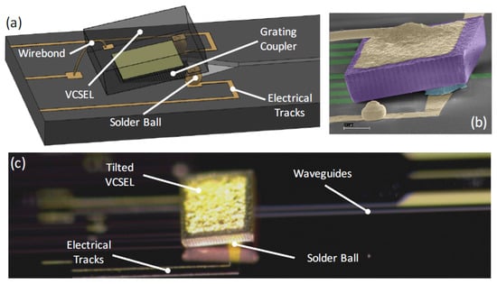 Direct integration of vertical cavity surface emitting lasers (VCSELs) is also a promising avenue for hybrid integration. Here, the significantly reduced footprint of a VCSEL chip (250 × 250 μm) over the MOB (1 × 1 mm) allows for very high integration densities. Planar VCSEL-to-PIC integration has been demonstrated, where photoresist based ‘wedges’ are used to refract the VCSEL mode onto the grating-coupler with the required near-normal angle-of-incidence [43]. Alternatively, a grating-coupler can be designed to couple the VCSEL-mode into a pair of opposing waveguides, which can then be recombined into a single-channel, after phase-compensation [44]. A tilted-VCSEL approach can also be used, where the VCSEL is directly flip-chipped onto the PIC with an asymmetric distribution of solder balls [45]—see Figure 10. By controlling the contact area of the bond-pads available for solder wetting, the tilt-angle of the VCSEL can be optimized. This tilted-VCSEL approach allows for passive flip-chip alignment to the PIC for rapid assembly at commercial volumes.